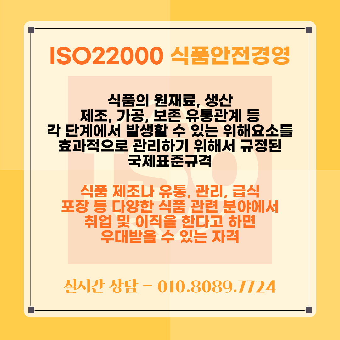 ISO 22000 자격증 취득할 수가 있습니다.