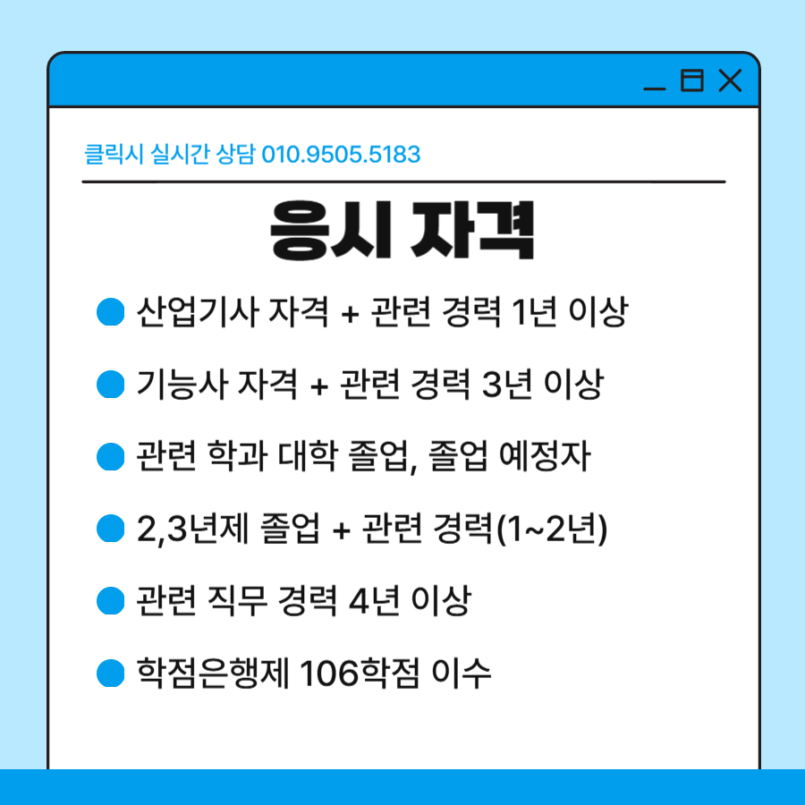 - 3년제 관련 학과 졸업 + 관련 직무 경력 1년 이상