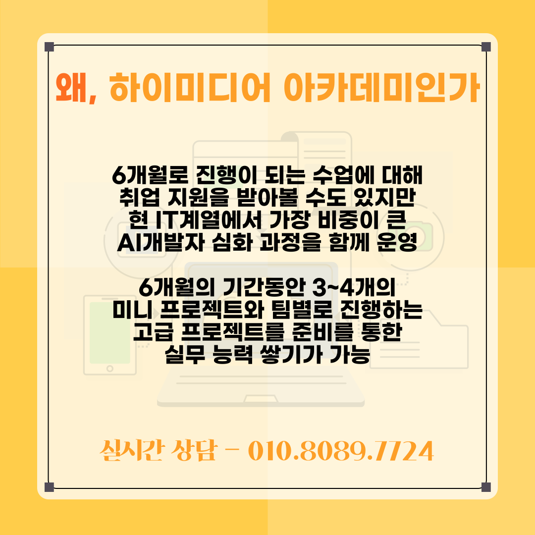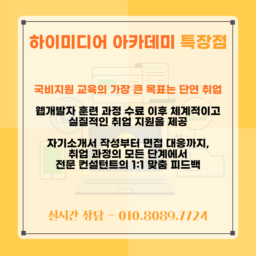 | 코딩 몰라도 가능, 100% 국비지원 웹개발자 학원, 하이미디어 아카데미 (0) | 2025.04.14 |